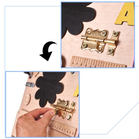 🛠️ Duża drewniana tablica manipulacyjna (75x50 cm) rozwija motorykę i kreatywność 🧠. Zawiera interaktywne elementy 🎛️, m.in. kłódkę, włącznik światła i labirynt. Idealna do nauki i zabawy!