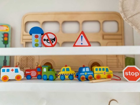 - 🚒 12 drewnianych klocków w kształcie pojazdów i znaków drogowych (straż pożarna, karetka, traktor, samochód itp.)