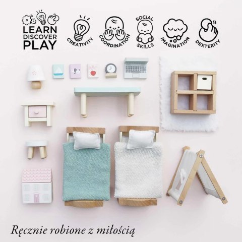 🛏 Stylowy pokój dziecięcy do domku dla lalek 🎨 12-elementowy zestaw z łóżkami, biurkiem i akcesoriami 🌿 Ekologiczne drewno FSC, bezpieczne farby wodne 🎭 Rozwija wyobraźnię i kreatywność dziecka 🎁 Idealny prezent dla małych miłośników domków dla lalek