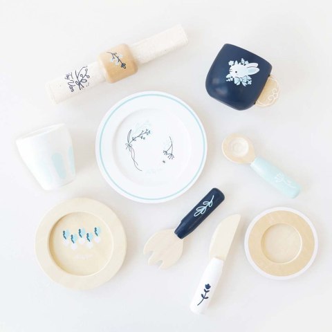 🍽️ Dzięki stylowemu zestawowi obiadowemu każde danie smakuje wyśmienicie! Elegancka zastawa została zaprojektowana w naturalnych odcieniach drewna, błękitu i bieli, a całość zdobią urocze motywy roślinne. To idealna zabawka do odgrywania ról i nauki etykiety przy stole! 🍵