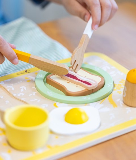 Wspaniały sposób na kreatywną zabawę i naukę dobrych manier przy stole! Ten drewniany zestaw śniadaniowy zapewnia dzieciom wiele godzin radosnej zabawy, jednocześnie rozwijając ich wyobraźnię i zdolności manualne. Idealny dla maluchów, które uwielbiają naśladować dorosłych w codziennych czynnościach.