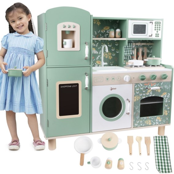 Przenieś swoje dziecko do świata kreatywnej zabawy! Ta piękna drewniana kuchnia w stylu vintage to spełnienie marzeń każdego małego kucharza. Wyposażona w kuchenkę, zlew, tablicę do pisania, szafki oraz zmywarkę, zapewnia realistyczną i angażującą zabawę.