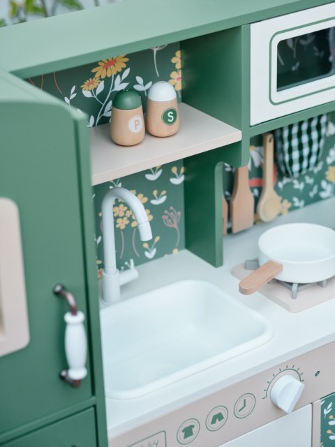 👩🍳 Drewniana kuchnia w stylu vintage 🌿 z tablicą, kuchenką, szafkami i zlewem. Pobudza kreatywność i rozwija zdolności manualne. W zestawie 15 akcesoriów do zabawy w gotowanie! 🍲
